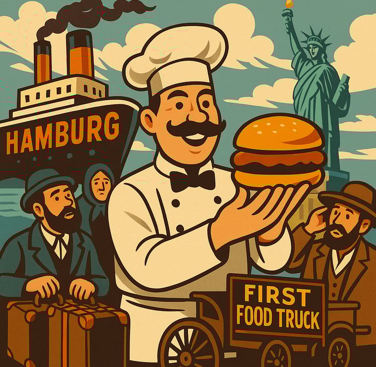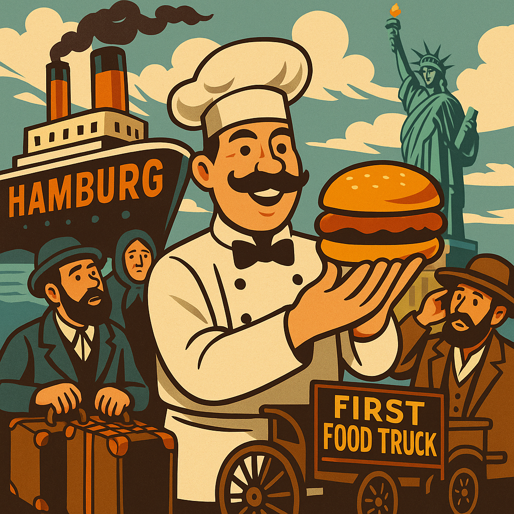 Com o avanço das grandes navegações e a intensificação da migração europeia, o famoso “Hamburg steak” embarcou rumo ao Novo Mundo. No final do século 19, milhares de imigrantes alemães atravessaram o Atlântico em busca de novas oportunidades nos Estados Unidos, levando na bagagem suas tradições, sabores e, claro, suas receitas. Entre elas, estava a carne moída temperada e moldada em discos — uma refeição simples, nutritiva e que já fazia sucesso nas tavernas de Hamburgo. Ao chegar em solo americano, esse prato caiu no gosto popular, especialmente nos portos de Nova York, onde era vendido como “bife ao estilo de Hamburgo” nos menus de restaurantes voltados aos recém-chegados.