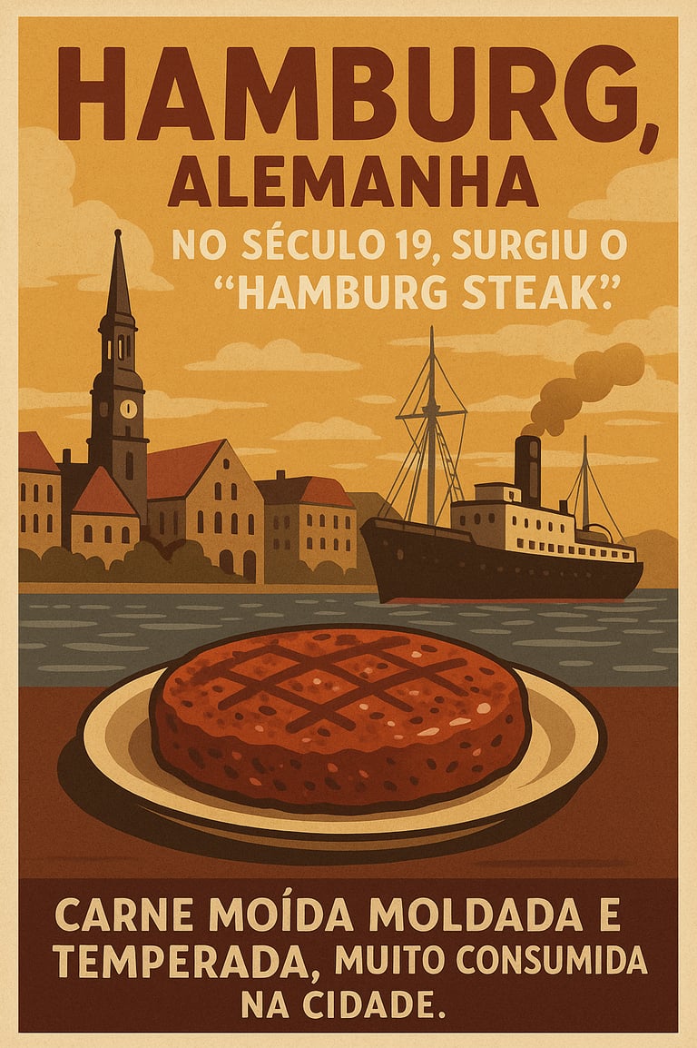 No coração da Alemanha, a cidade portuária de Hamburgo pulsava ao ritmo do comércio marítimo e das rotas internacionais no século 19. Era um ponto de encontro entre culturas, mercadorias e sabores. Foi nesse cenário cosmopolita que a carne moída ganhou novo status: temperada com especiarias locais, moldada em formato de bife e servida grelhada, ela ficou conhecida como “Hamburg steak” — uma refeição nutritiva, prática e deliciosa, perfeita para trabalhadores, viajantes e marinheiros que passavam pelo porto.